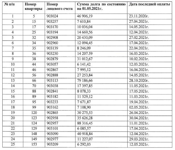 Собственникам указанных в списке помещений в срок до 01.06.2021 года необходимо оплатить образовавшуюся задолженность в полном объеме.