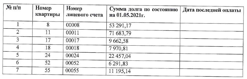 По состоянию на 01.05.2021 года сформировалась задолженность за оплату коммунальных услуг следующих помещений: